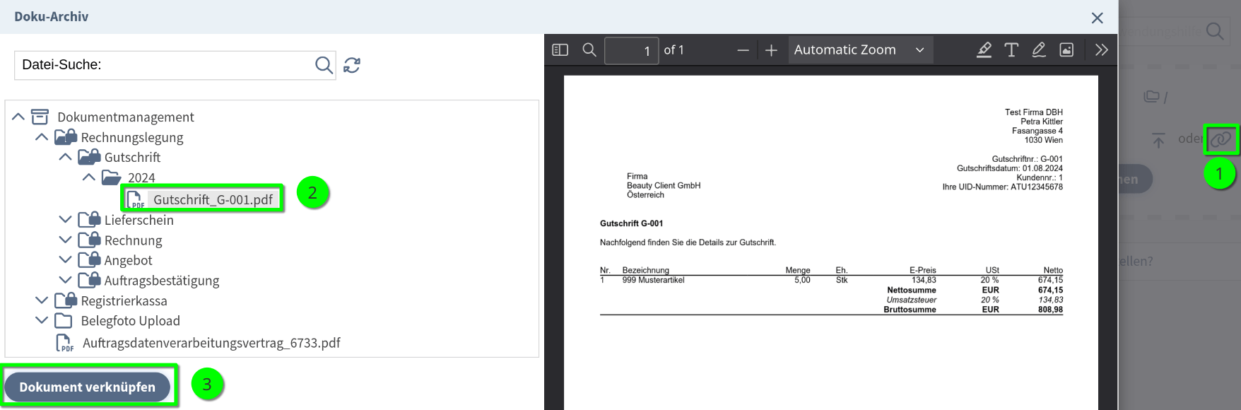 Sie wählen im Verzeichnisbaum die gewünschte Datei aus und erhalten eine Vorschau, danach klicken Sie auf die Schaltfläche "Dokument verknüpfen".