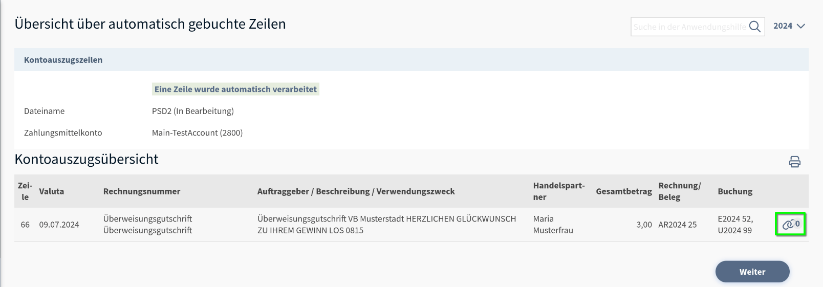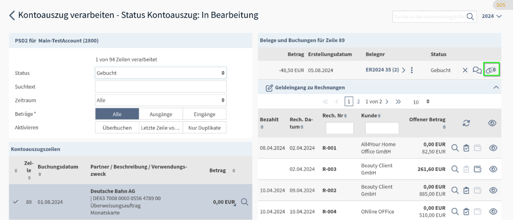 Nachdem Sie auf der rechten Seite eine Buchungsart ausgewählt haben, wie z.B. Eingangsrechnung und diese verbucht haben, sehen Sie rechts das Kettensymbol. Damit können Sie den von Ihnen dazugehörigen abgespeicherten Beleg verknüpfen.