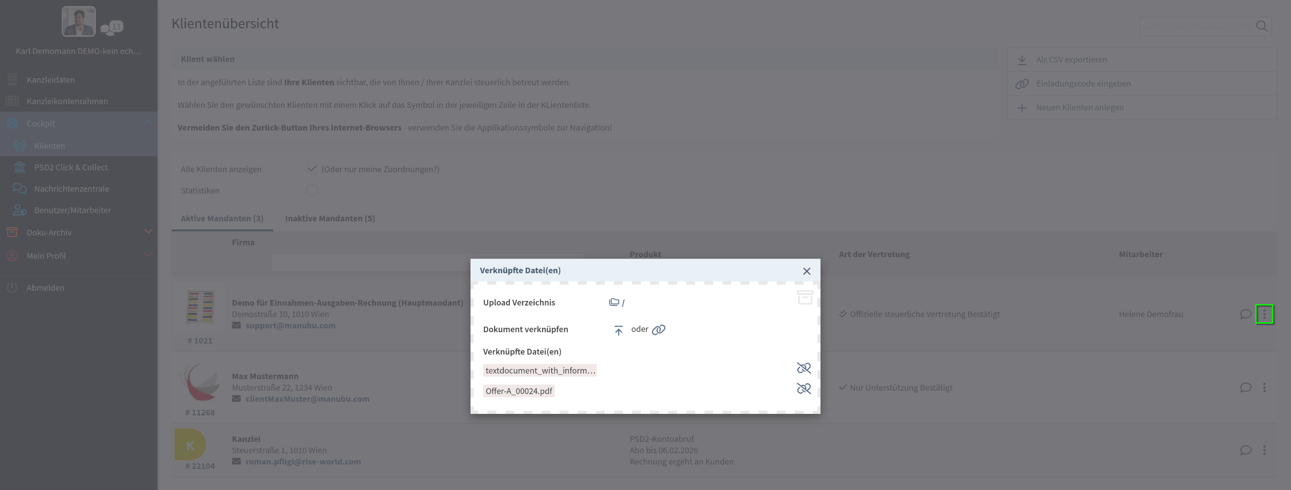 Ist das Doku-Archiv aktiv, kann die Klientenverwaltung über die Schaltfläche  auch zur Speicherung von Informationen, wie Verträgen, Vollmachen, etc direkt beim Mandanten verwendet werden. Diese Daten sind nur für den Berater ersichtlich!