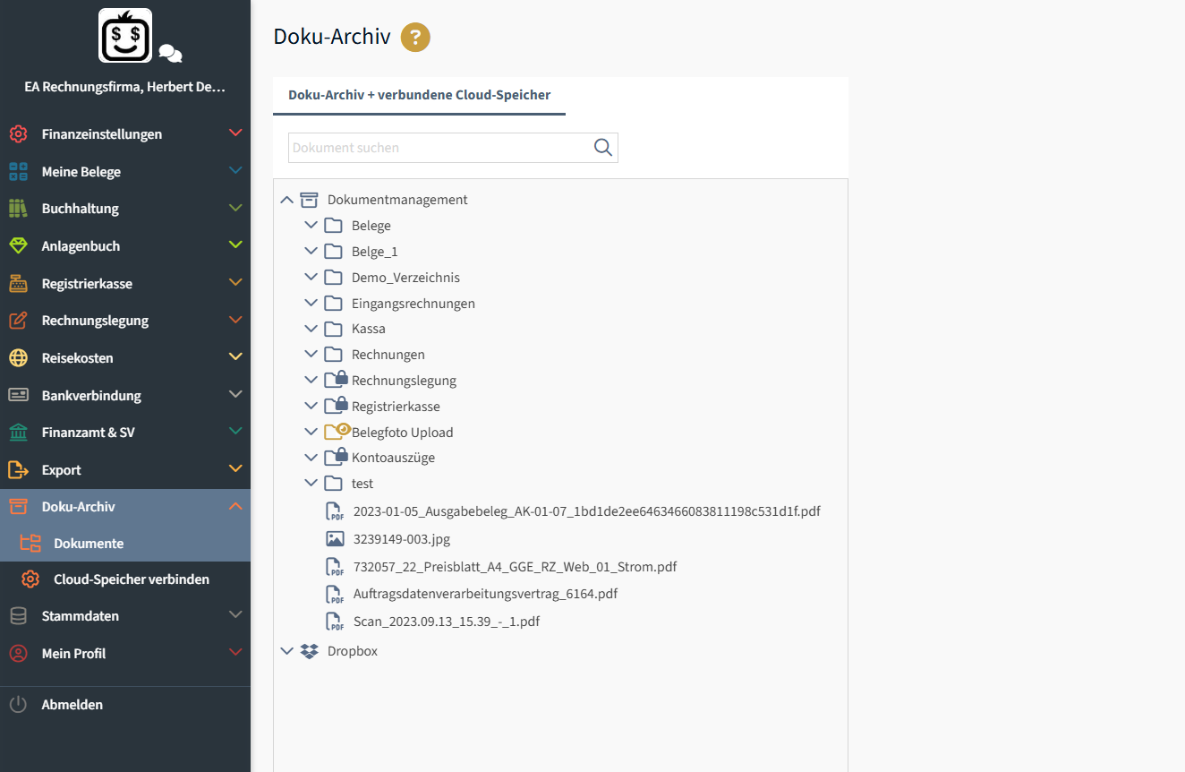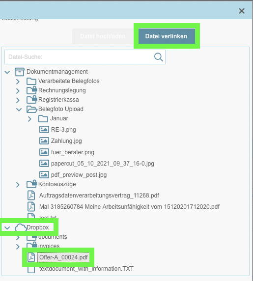 Wurde Ihr Cloud-Speicher für FreeFinance bereits freigeschaltet, besteht die Möglichkeit alle Dateien und Dokumente direkt zu verlinken. Im Verzeichnisbaum sehen Sie für jeden verbundenen Cloud-Speicher einen eigenen Hauptknoten.