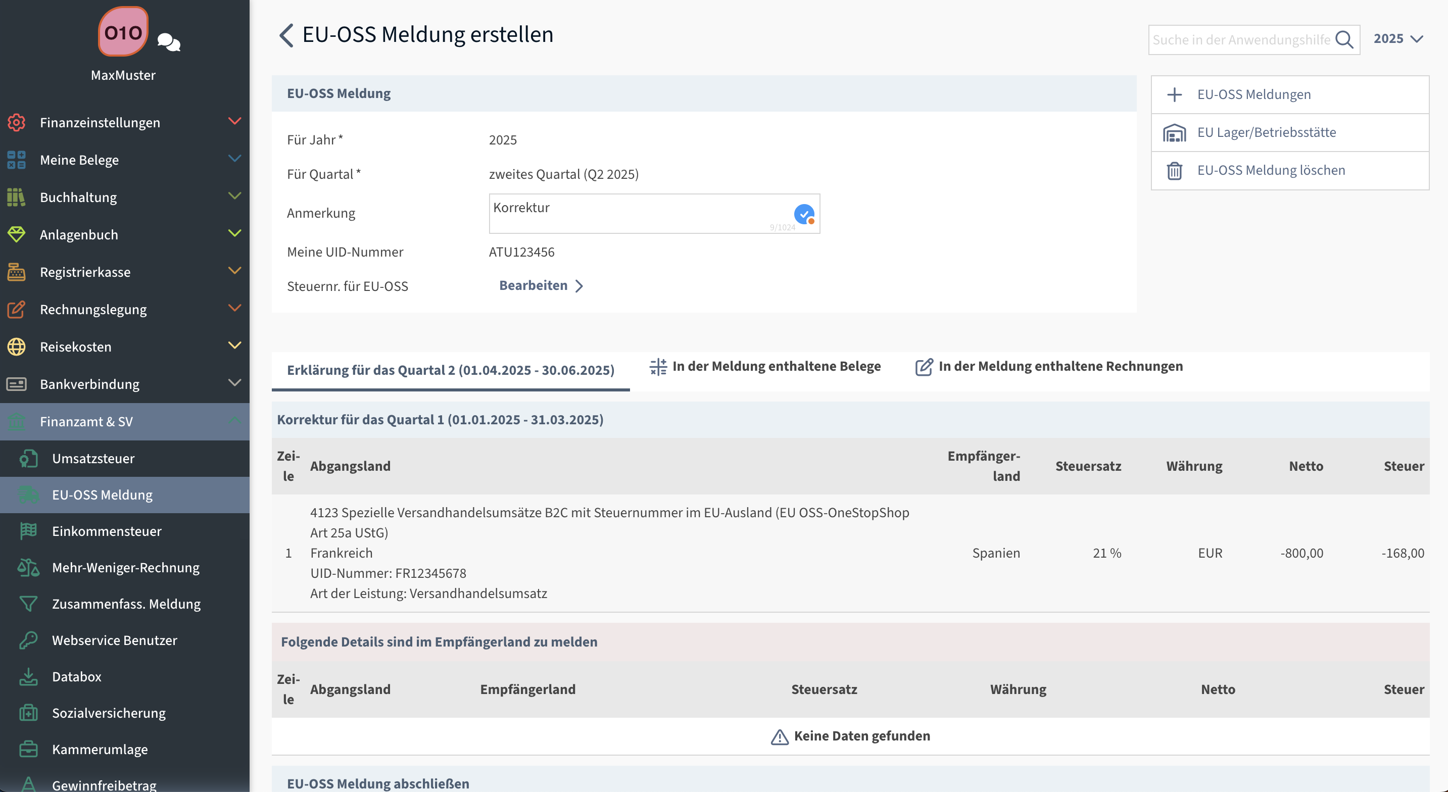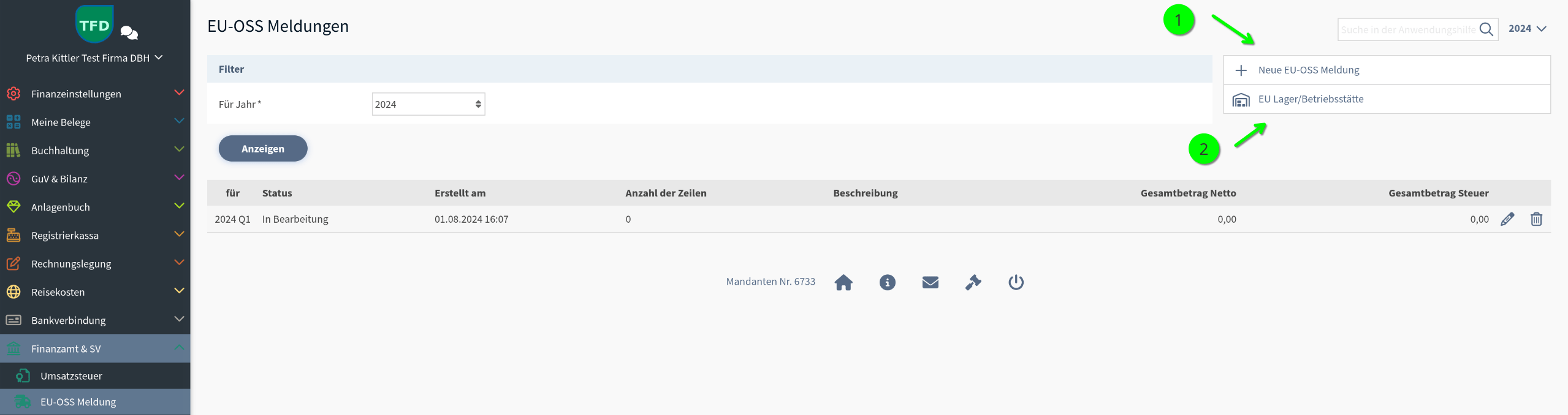 Im Hauptmenü unter Finanzamt & SV findet sich die EU-OSS-Meldung. Alle bestehenden Meldungen werden hier gelistet.