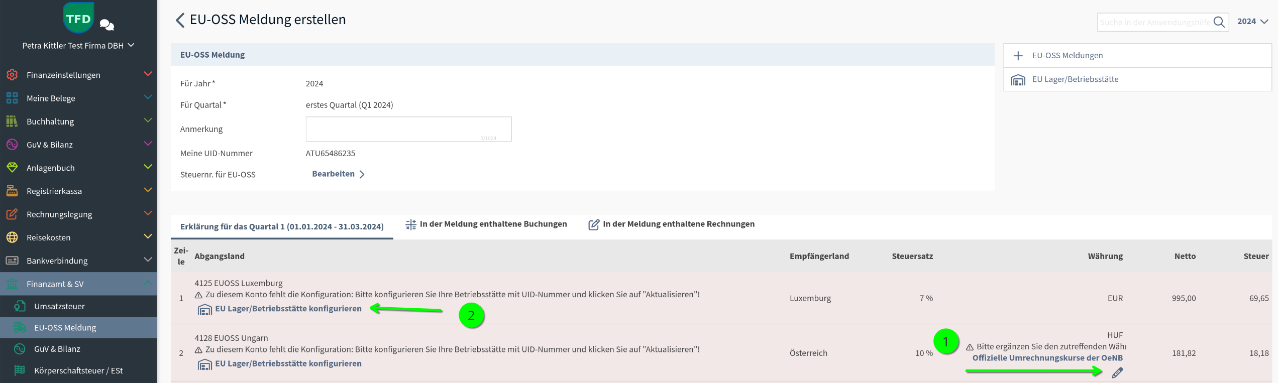 - Pro Konto sind dann in der EU-OSS Meldung über die Schaltfläche "EU Lager/Betriebsstätten" anzulegen. Dort ist das Land für ein Lager, bzw. die UID-Nummer für eine Betriebsstätte zu ergänzen.