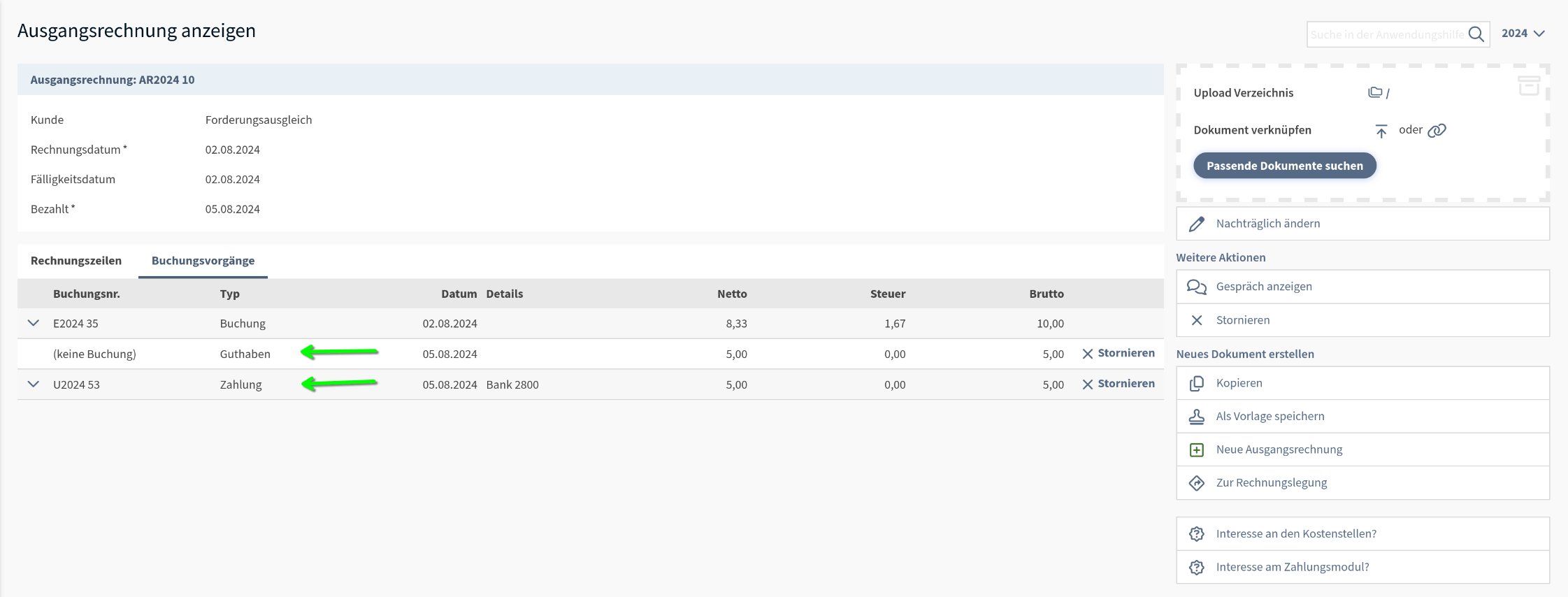 Dieser offene Posten kann nun wie oben beschrieben durch einen Zahlungseingang geschlossen werden.