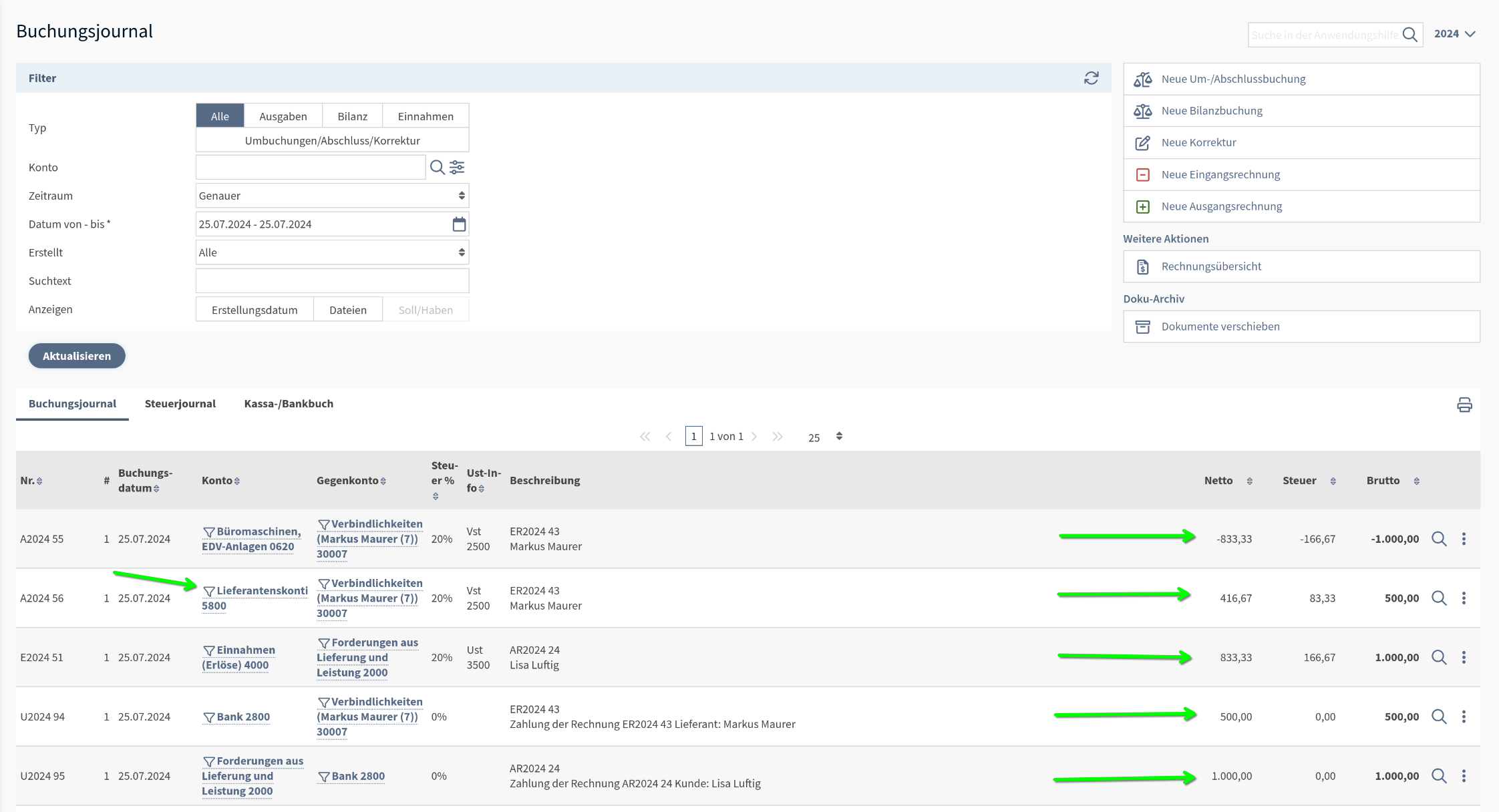 Beispielhaft sehen wir hier die korrekte Buchung im Falle eines, in diesem Fall sehr großzügigen, Skontos. Es bestehen die ursprünglichen Buchungen der Eingangs- und Ausgangsrechnung, sowie die vollständige Umbuchung bei Lisa Luftig und die teilweise Umbuchung bei Markus Maurer, sowie die zusätzliche Buchung des Skontos.