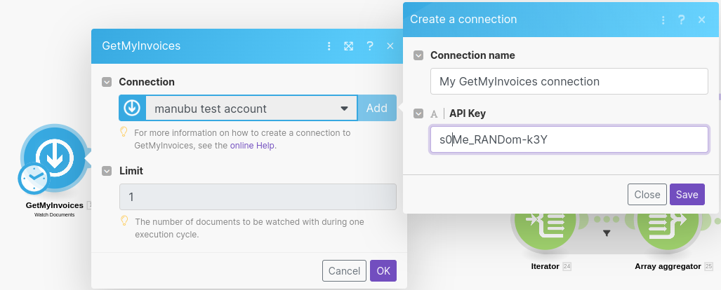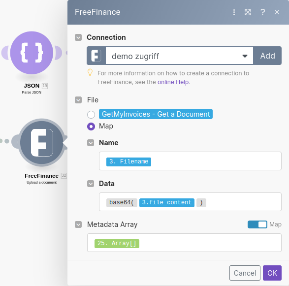 Finden Sie hier die notwendigen Infos, wie Sie GetMyInvoices über make.com anbinden können, um Ihre dort gesammelten Rechnungsdokumente automatisch in FreeFinance speichern.