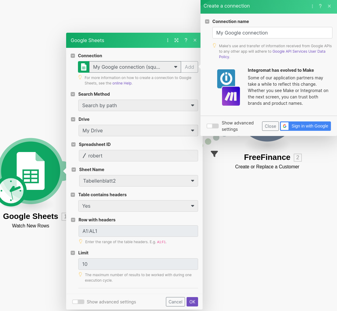 Finden Sie hier die notwendigen Infos, wie Sie Google-Sheets über make.com anbinden können, um Ihre dort eingetragenen Kunden und Lieferanten automatisch in FreeFinance speichern zu können.