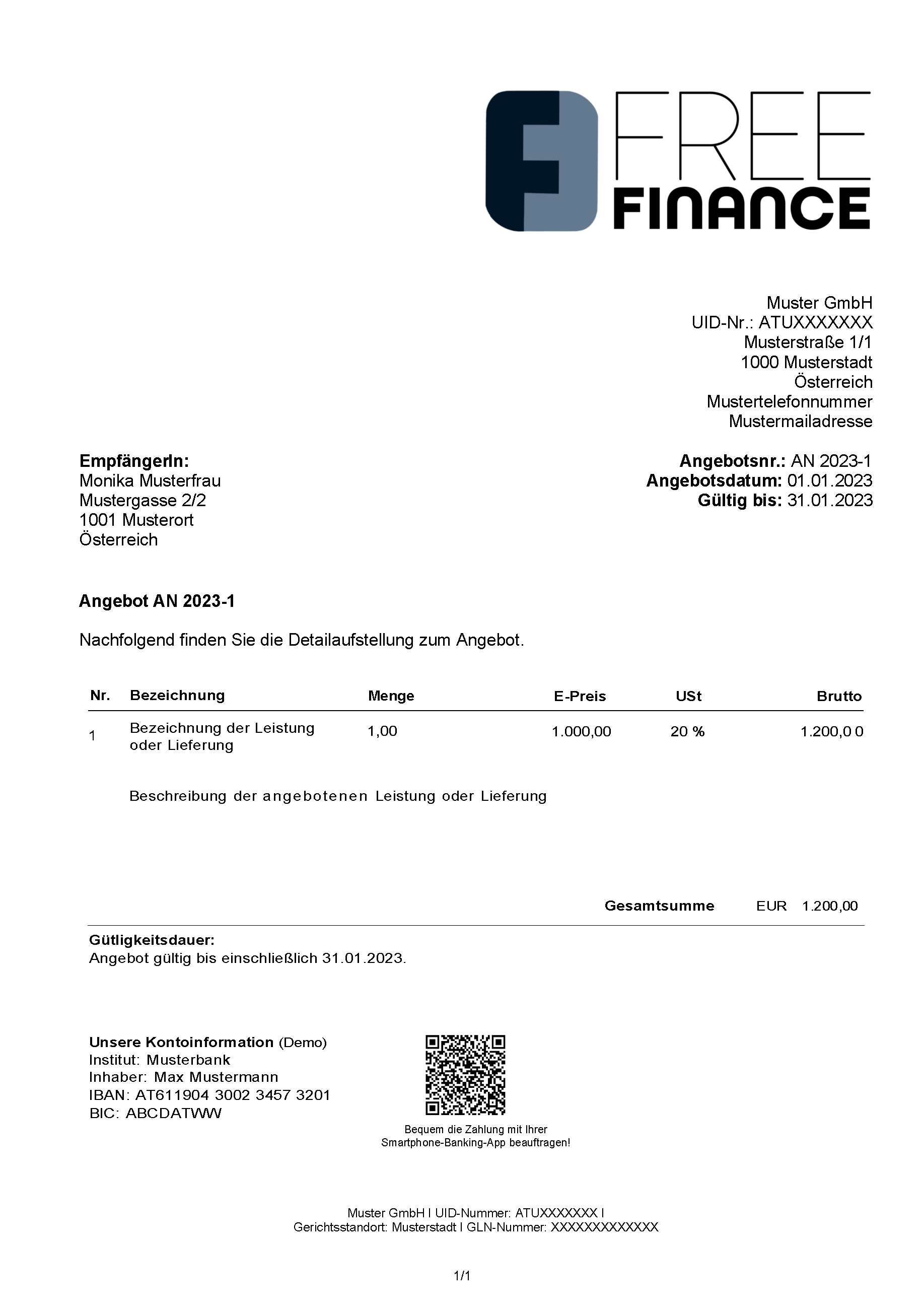 Ein Angebot ist auch als Geschäftsbrief zu behandeln. Damit müssen im Kopf oder Fuß die gesetzlichen Pflichtangaben erscheinen – bei im Firmenbuch eingetragenen Unternehmen nach § 14 UGB, bei nicht eingetragenen Unternehmern nach § 63 GewO.
