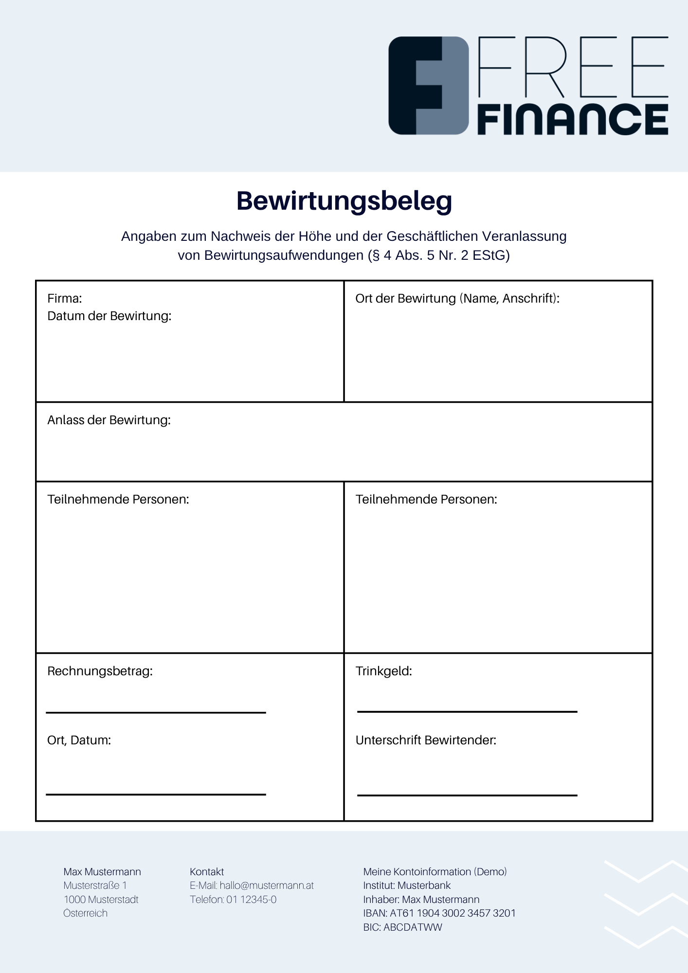 In Österreich ist kein eigener Vordruck vorgeschrieben; für Deutschland gibt es jedoch eine Bewirtungsbeleg-Vorlage, mit der die dort geforderten Pflichtangaben (z. B. Anlass, bewirtete Personen, Unterschrift) erfasst werden. |