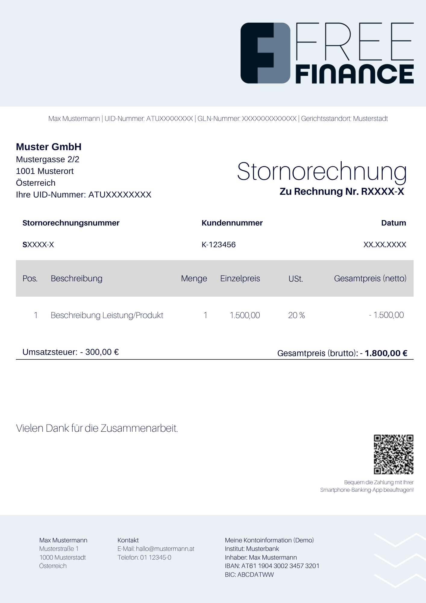 Stornierungshinweis: Ein Hinweis wie „Stornierung der Rechnung Nummer XXX“, wobei XXX die Nummer der ursprünglichen Rechnung ist.